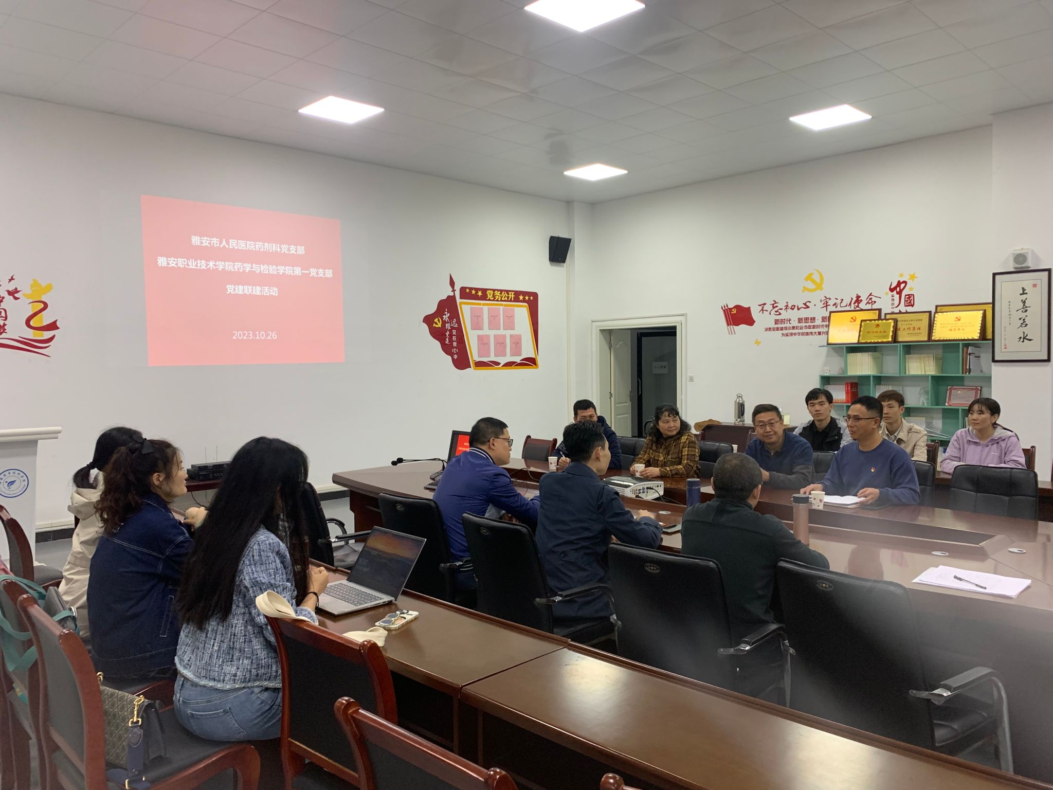为深入贯彻落实党的二十大精神,积极探索校企合作,2023年10月26日下午,雅安市人民医院药剂科党支部来校与太阳成集团tyc33455cc第一党支部联合开展“党建+业务”联建活动。此次党建联建活动在经开区校区太阳成集团tyc33455cc会议室举行,两支部共计15名党员同志参加。